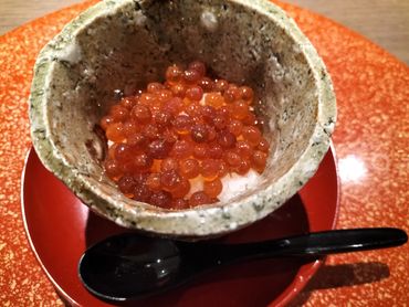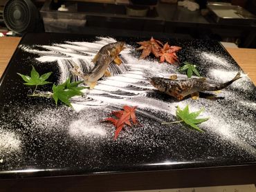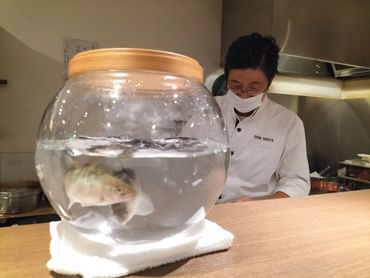 Here is the magical 'kaiseki', Japanese traditional course menu, thanks to which I have extended my life several years by enjoying it. As a starter, I opened a persimmon and found persimmon salad with mashed tofu and flower buds that woke up my stomach gently for the next one. Then in front of me was a plate of chestnut, ginkgo nuts, Matsutake mushrooms, sweet potatoes with a bit of simmered fish. At the time, I was surely in the middle of the autumn forest by a comfortable stream. Dai showed me two river smelts swimming to give me time for a short prayer to them. Fish appeared later but were not dead, still alive! It does not mean half-cooked and alive. Totally cooked still alive. Have a look at the picture! Before you believe that you must be in paradise, you will come across sashimi right in season, a subtle taste Japanese truffle Matsutake and conger soup with squeezed citrus juice, just a little steamed sticky rice with chestnuts, the best tempura in your life, and another white meat fish that you cannot tell its name but is awfully delicious with various condiments. This will tempt you to order another bottle of best sake in this restaurant! Kaiseki always ends with a little bit of rice and soup with pickles. It is like a period of a sentence. Dai places this period at the right time in the right way. I had not known the taste of rice, taro, kelp and salt was this gorgeous.