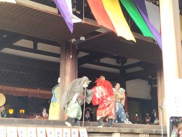 It has not finished yet. We will go on to another Buddhist temple next. Get ready! We will walk about half an hour to the east. You can find the similar crowd here as Kitano Ten’mangu shrine. If you care for sake, you can sip some for free. Buddha buys it for you. When you are getting happier and warmer, the announcement teaches us that this temple is the only structure which survived a horrible Kyoto war in the 15th century. No other structures date back to that time, even if you have seen other beautiful and old buildings in Kyoto. Secure your standing position in front of the stage to enjoy the dancing and comical drama. During the drama, all the devils are scared away, not by nuclear bombs but by peaceful roasted soybeans! Then comes the 'Mame maki', which is the 'scattering beans' ritual. Do you think you have gotten enough beans? In this temple, the Senbon Shakado, you will receive peanuts for a change.